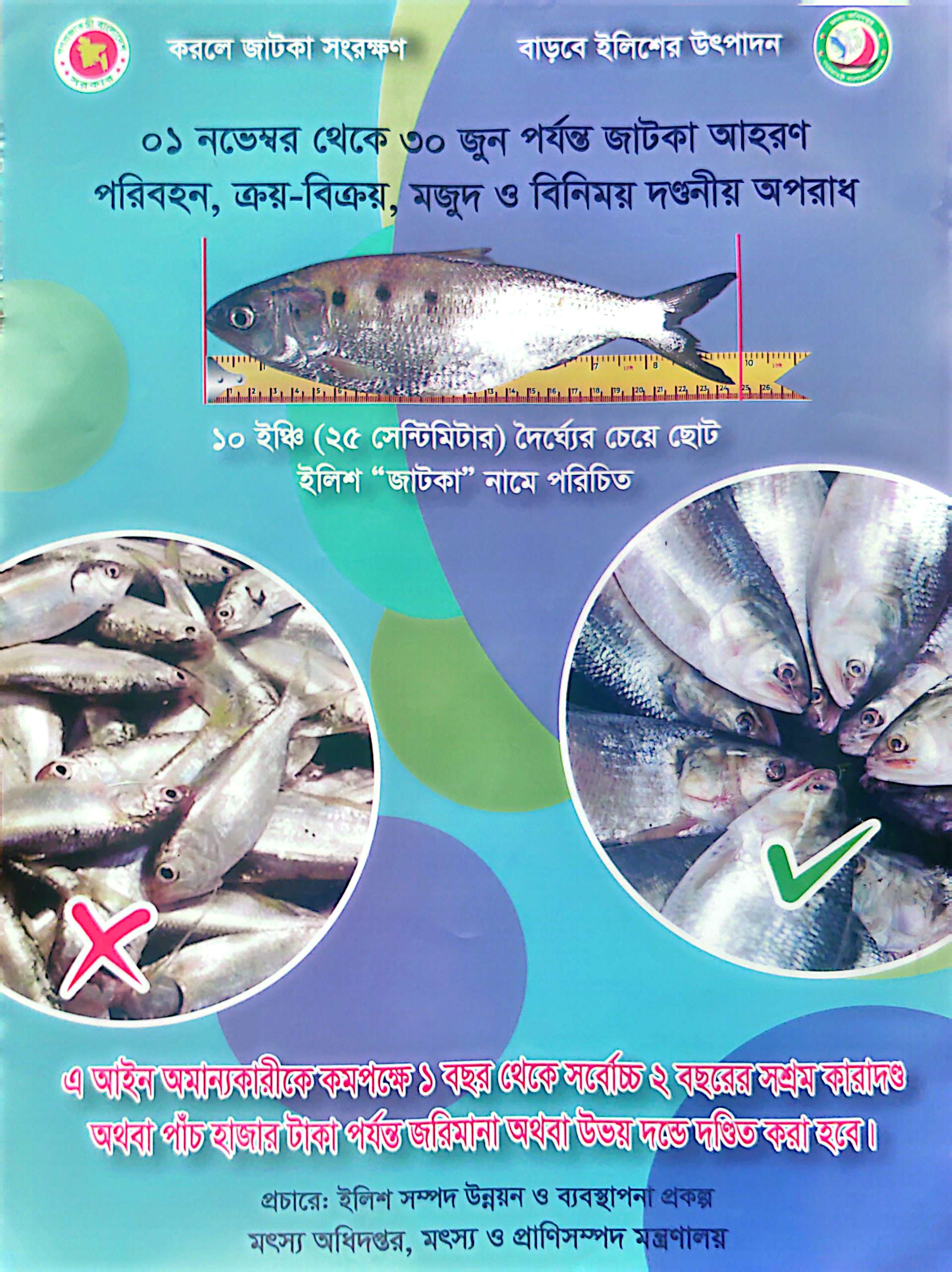 ০১ নভেম্বর থেকে ৩০ জুন পযন্ত জাটকা আহরন, পরিবহন, ক্রয়-বিক্রয়, মজুদ, ও বিনিময় দন্ডনীয় অপরাধ