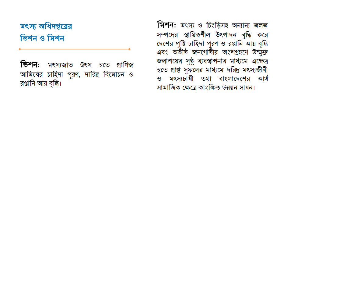 মিশন: মৎস্য ও চিংড়িসহ অন্যান্য জলজ সম্পদের স্থায়িত্বশীল উৎপদান বৃদ্ধি দেশের পুষ্টি চাহিদা পূরণ ও রপ্তানি আয় বৃদ্ধি ও অভীষ্ট জনগোষ্ঠীল অংশগ্রহণে উন্মুক্ত জলাশয়ের ব্যবস্থাপনার মাধ্যমে এক্ষেত্র হতে প্রাপ্ত সুফলের মাধ্যমে দরিদ্র মৎস্যজীবী ও মৎস্যচাষী তথা বাংলাদেশের সামাজিক কাংক্ষিত উন্নয়ন সাধন।